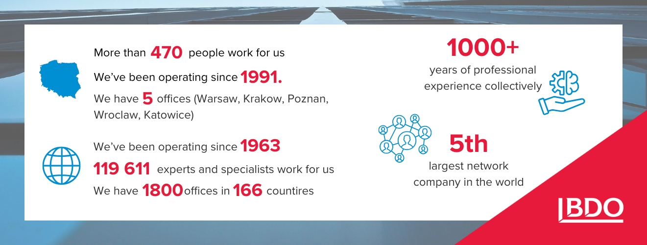 BDO is one of the leading global networks of audit and advisory firms. In Poland, we have been present since 1991, actively contributing to the growth and transformation of the capital market. For over three decades, we have been evolving with our Clients, tailoring our services to market realities and the individual needs of each business.